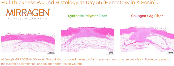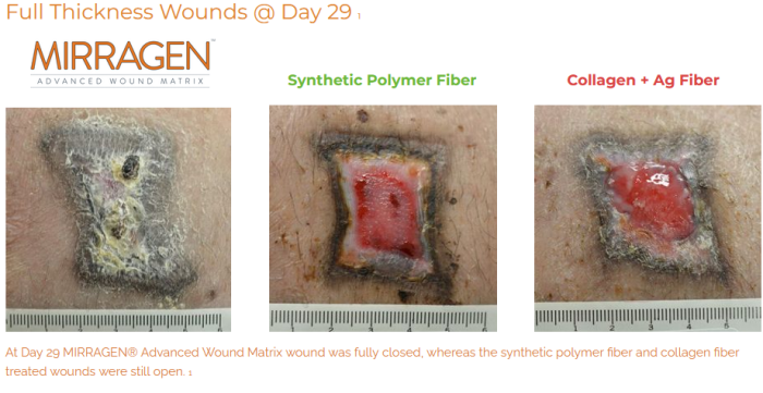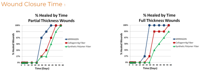- Full and partial thickness wounds covered with the MIRRAGENĀ® Advanced Wound Matrix healed in less time and more completely compared to similar devices in head-to-head testing.