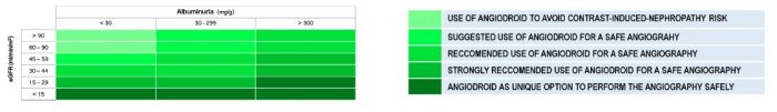 Therapeutic indications to the use of CO2 in angiographyThe Estimated Glomerular Filtration Rate (eGFR, measured in mL/min/1.73m2) is an indicator of kidney function, and is the most important clinical parameter in evaluating the use CO2 as contrast media in angiography. In addition, other risk factors must be taken into consideration. Albuminuria is an important factor, as it influences the therapeutic indications.