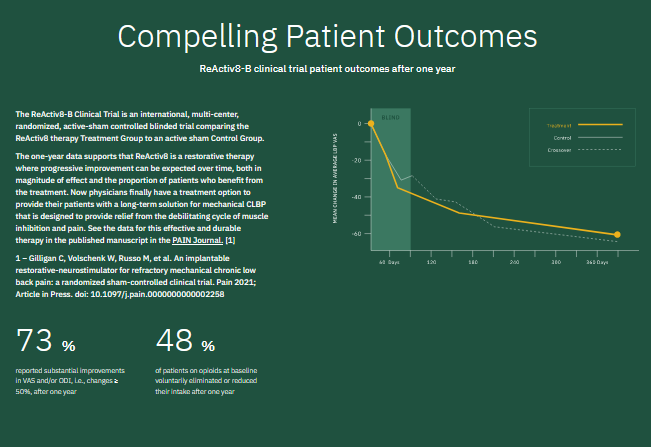 ReActiv8, the only FDA-approved restorative device of its kind, uses a restorative treatment approach that targets underlying multifidus muscle dysfunction. Analgesic (or palliative) treatment options have limited effectiveness and durability in patients with mechanical CLBP. [1]