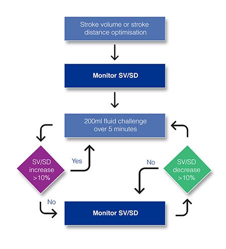 Stroke Volume Optimisation (SVO) is in its simplest form the administration of fluid, most often a colloid, guided by an algorithm to normalise Stroke Volume without the risk of fluid overload. The 10% SV change algorithm for SVO utilises the Frank-Starling law, which established the relationship between left ventricular stroke volume and left ventricular end diastolic volume.