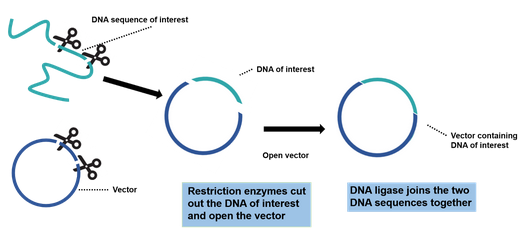 "Cutting" refers to the use of sequence-specific restriction enzymes to cut the vector DNA, or cut out the target gene. "Connecting" refers to the use of DNA ligase to connect the target DNA with the vector DNA to form a recombinant DNA molecule. "Transferring" refers to the delivery of recombinant DNA molecules into host cells for replication and amplification by special methods. "Selecting" refers to selecting individuals carrying recombinant DNA molecules from the host population.