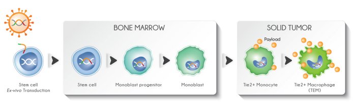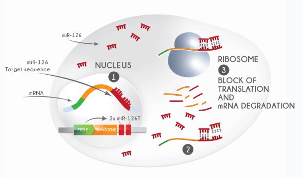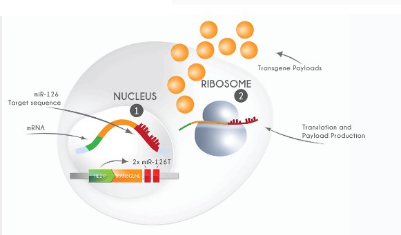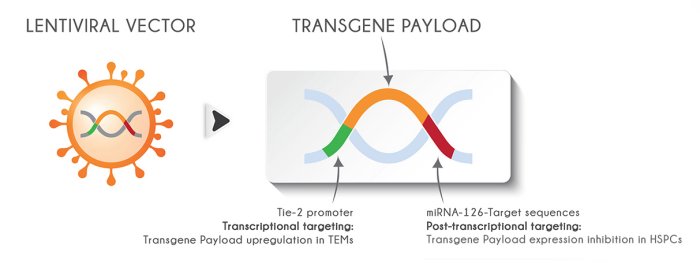 Our proprietary platform consists of dual control achieved at the transcriptional and post-transcriptional level. These ensure therapeutics are released within the tumor. A Tie-2 promoter ensures the transgene transcription occurs in TEMs, while miRNA-126 target sequences inhibit expression of the transgene in HSPCs.