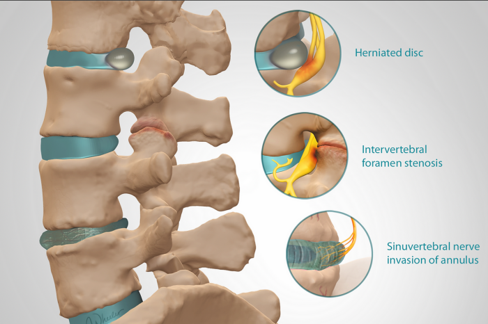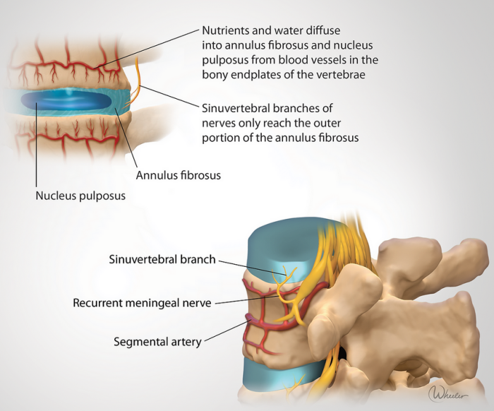Healthy intervertebral discs act like shock absorbers for the spine (Figure 2), however, as the body ages, degenerative changes occur as part of the body and tissue’s normal wear and tear. Furthermore, the cause of dLBP may be directly related to injury sustained by the nucleus pulposus (NP). This injury can be due to excessive wear and tear from poor biomechanics or any significant accident or injury. The damage to the disc leads to inflammation within the NP and microtearing of the annulus of the disc that contains the nucleus. The nucleus tissue has poor blood supply and inflammation takes very long to resolve, if it can be resolved at all. Additionally, abnormally sensitive nerve endings grow into these microtears and render the disc hypersensitive to movements that do not otherwise cause pain. Other spinal elements may be affected as degeneration progresses. Figure 3 illustrates some of the degenerative changes that might occur within the lumbar spine.