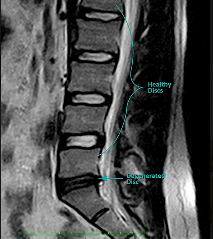 Degenerative disc changes are often characterized by a loss of water content in the disc (confirmed using a T-2 weighted MRI sequence — see Figure 4) and various changes to its elastic and mechanical properties. This can lead to dLBP. It is important to note that although degenerative changes may be observed, the pain may be unremarkable. Conversely, imaging may reveal very mild degenerative changes, yet the patient may be experiencing significant pain.