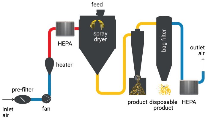 Efficient recovery of active pharmaceutical ingredients (APIs) or final product formulations (FPFs) after a spray dryer can be quite challenging, depending on the particle size. The same problem occurs in many milling, micronization and tablet pressing applications. The preferred way to recover these sensitive and expensive products is with cyclone collectors due to their direct and sanitary powder capture. Unlike bag filters or wet scrubbers, cyclones minimize filter or product contamination and product cross contamination and can easily handle a wide range of operating temperature, pressure and moisture conditions.