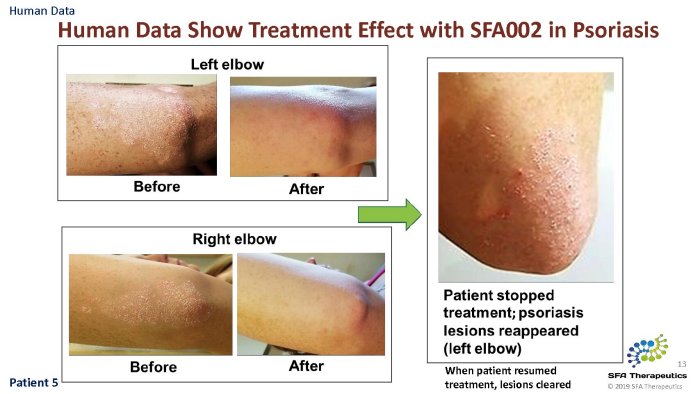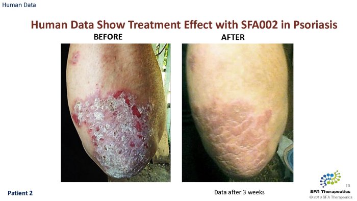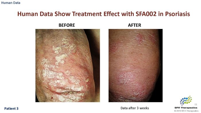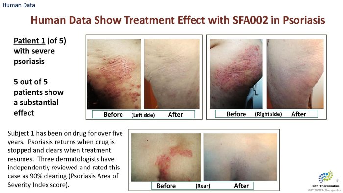 SFA Therapeutics will begin a Phase 1b trial of patients suffering from Mild to moderate Psoriasis 3Q2020. The study will be conducted in conjunction with Temple University in Philadelphia, PA. Estimated start date is 1 October, 2020.