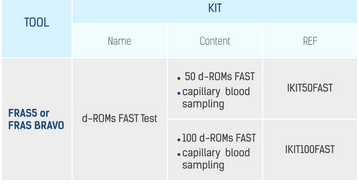 The d-ROMs FAST Test is a photometric test that can be used in an outpatient setting, in a pharmacy on a dedicated system (FRAS5 or FRAS BRAVO) or in any laboratory equipped with a photometer. The test is performed on just 10 µl of heparinized plasma or serum in just 2.5 minutes. The results of the d-ROMs FAST Test are expressed in U.CARR (1 U.CARR is equivalent to the signal developed by a 0.08 mg/dl solution of hydrogen peroxide). The d-ROMs FAST Test can be performed alone or in combination with the PAT test in the REDOX OB FAST kit.
