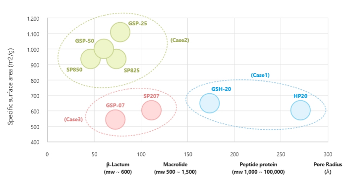 Separation can be achieved using synthetic adsorbents with various pore sizes and surface areas based on the principle of molecular sieves, or by using Van der Waals forces for non-polar substances. The separation of cephalosporin C is a representative example. Synthetic Adsorbents are also widely used in various applications such as separation, purification, and decolorization of pharmaceuticals and food products.