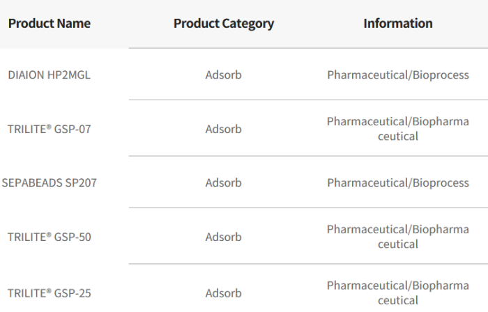 TRILITEĀ® ion exchange resins and synthetic adsorbents can be used in various separation and purification processes for pharmaceuticals and food raw materials. Some representative examples are as follows.