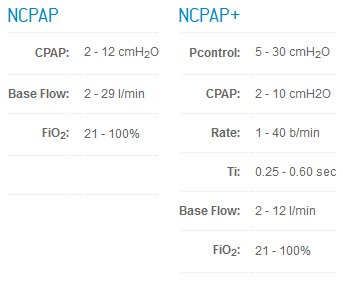 NCPAP+ makes it possible to deliver a set pressure control level above PEEP at a user defined rate, inspiratory time, flow and FiO2. Alarms are set automatically and provide peace of mind against disconnections, occlusions and low or high pressure.