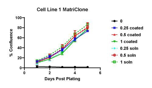 Cell Line 1 and 2 showed little difference in growth rates when MatriClone was used to pre-coat plates, versus in-solution. There was also minimal difference in growth rates between the different concentrations tested for both methods.