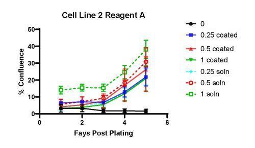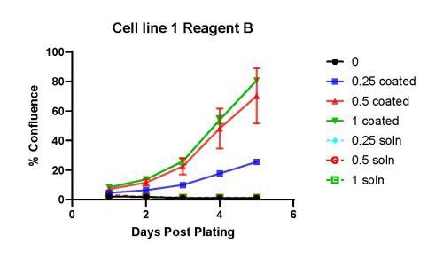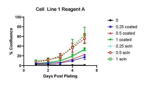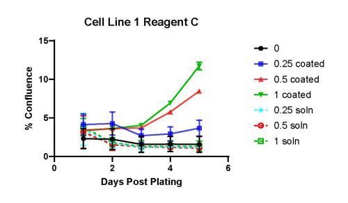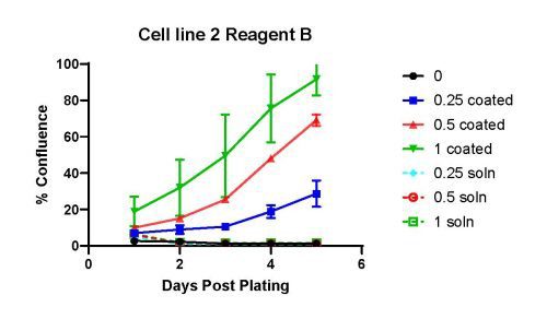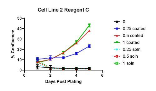 The next observation of note is that Cell Line 1 and 2 both attached and grew at all matrix concentrations when the conventional pre-coating method was followed, however the growth of both was noticeably slower when Reagent C was used.