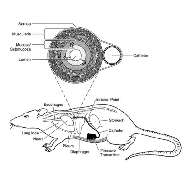 Using easyTEL+ M1 telemetry implants, they monitored respiratory function in rats under both baseline and challenge conditions. The pressure catheter was surgically implanted into the thoracic cavity, beneath the esophageal serosa, allowing for chronic, high-fidelity measurement of intrapleural pressure.
