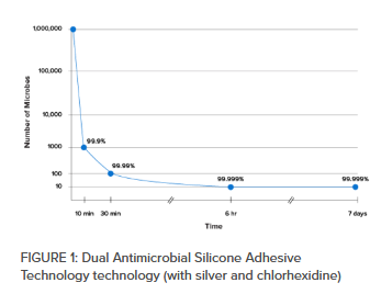 The rapid and sustained antimicrobial activity of our dual antimicrobial silicone adhesive technology is clearly demonstrated by the log reduction data of Figure 1. When challenged with approximately one million microorganisms from eight common pathogenic microbes, it was able to kill on average 99.9% of the inoculum within 10 minutes and 99.99% after 30 minutes of contact time. All microorganisms reached a 4 log reduction or greater by 6 hours - which was maintained for the remainder of the 7 day study.* The reduction value represents essentially a complete eradication of the initial microbial challenge.
