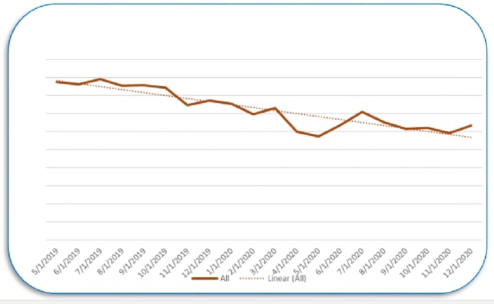 The overall number of incidents is down 18% compared with one year ago. April had the lowest number of incidents – which is not surprising given that most of the country was under a tight lockdown. Since then, the number of incidents has been rising steadily, increasing by 5% by December 2020. The good news is that trends continue to show improvements month over month across the board.