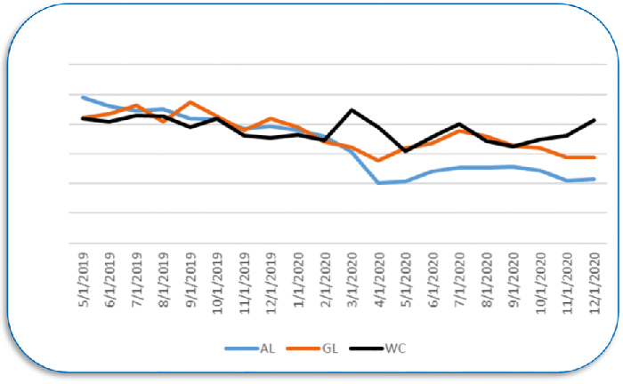 Workers’ Compensation. The volume of WC incidents jumped 6% since April – and 14% YOY. Interestingly, the WC volume fluctuated widely over those months, perhaps as a reflection of rolling lockdowns.