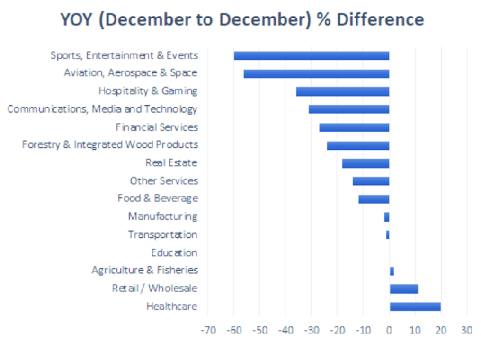 Sports, Entertainment and Events. Even though professional sporting events resumed, fans remain largely absent from the stands, leading to a drop in incidents of 60% compared with December 2019 – the biggest reduction of all industries. Since the peak of the lockdown in April, however, the number of incidents is up 91%.