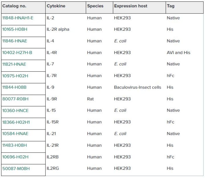 Sino Biological Inc. has developed a panel of high-quality recombinant cytokines and receptors to support the research on the common gamma chain cytokine family (Table 1 and Fig. 2).