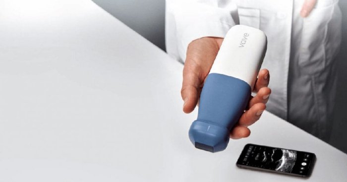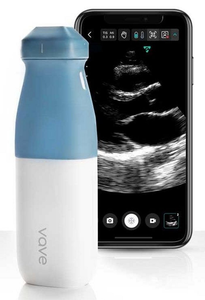 The ultrasonic device is as easy to carry as a stethoscope and wirelessly connects with any smartphone or tablet.