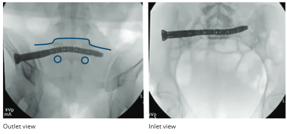 The CurvaFix IM implant (110 mm in length) curved to be in the correct position in the outlet view. In the inlet view, the CurvaFix IM Implant curved posteriorly to stay within the sacrum.