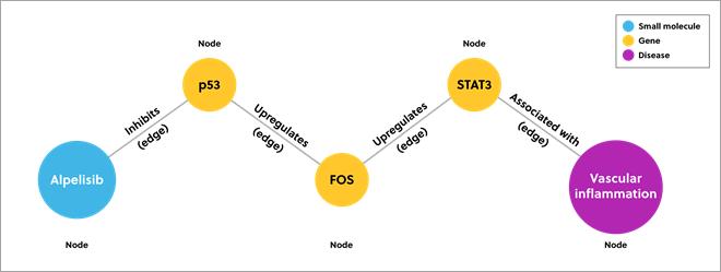 A knowledge graph combines data from disparate sources to model a particular area. It describes data in nodes and edges. Nodes represent each point of data and edges represent the relationship between them. The image below provides a simplified example of a knowledge graph that predicts which drugs might inhibit vascular inflammation.
