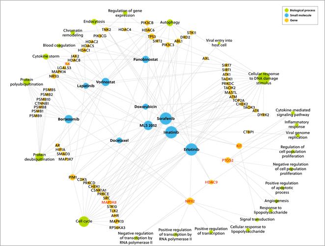 For example, a cytokine storm was considered an important connection. We then evaluated the relationships between the small molecules and the interactions with the genes and biological processes identified in our two-component approach. Score boosts were given to important connections, such as to cytokine storm and to small molecules that have an activating relationship with genes, given the rarity of these occurrences.