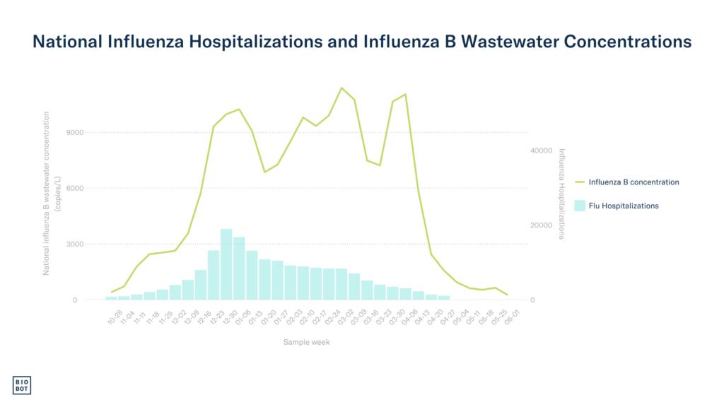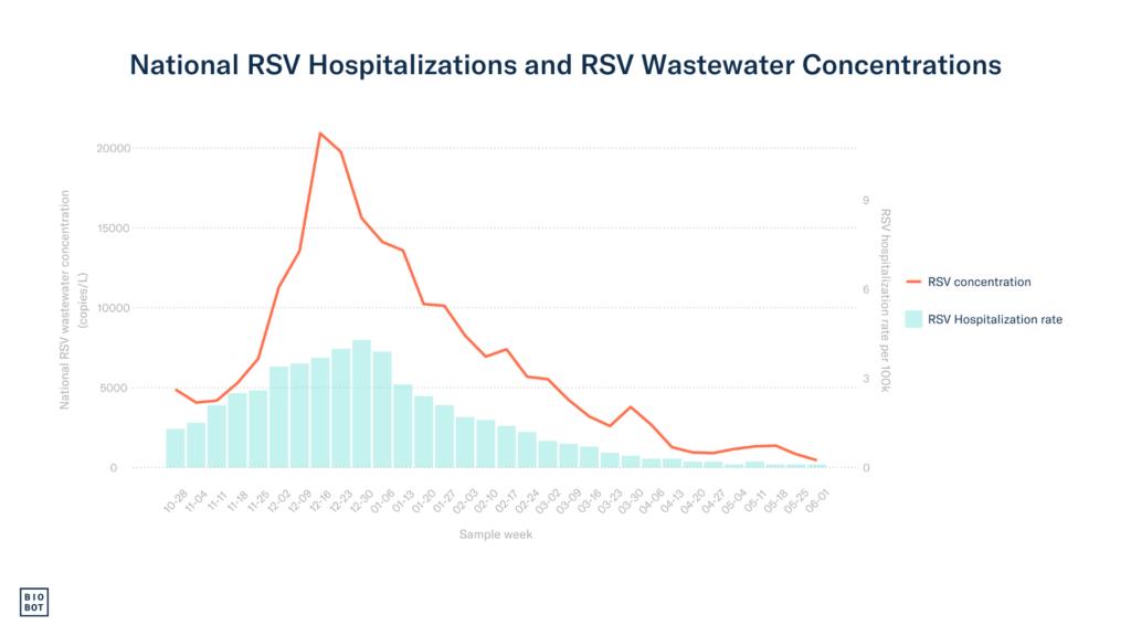 This was the first respiratory illness season Biobot collected data for all three major respiratory viruses: SARS-CoV-2, influenza A & B, and RSV. We began testing wastewater samples for influenza virus A & B and RSV in late October 2023. As data were analyzed, we shared national and regional average concentration trends through our weekly Respiratory Report blog series. It has consistently been found that SARS-CoV-2 wastewater concentrations are a leading indicator for increases in COVID-19 hospitalizations by one to four weeks(1). To understand how influenza and RSV wastewater concentrations compare to clinical data, we calculated Spearman’s correlation coefficients for national population-weighted wastewater concentrations and national hospitalization data for influenza and RSV, in addition to SARS-CoV-2. These analyses were done retrospectively at the end of the season, and do not account for real-time reporting delays in hospitalization data, which are consistently delayed by at least one week, and often two. COVID-19 and influenza hospitalization data were obtained from the National Hospitalizations Safety Network prior to May 1st, 2024 when the CDC discontinued mandatory hospitalization reporting. National RSV hospitalization rates were obtained from the CDC RSV-NET surveillance system.