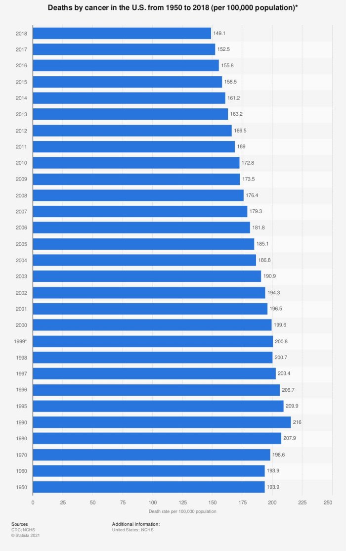 The study conducted by the US Department of Health and Human Services focuses on how much progress our healthcare system has made since the 1950s. This study shows how cancer-related deaths have decreased significantly due to the research conducted that has helped understand the cancers, create drugs and effectively treat patients. Each year shows a decrease, and we can expect to see the same trend in future years.