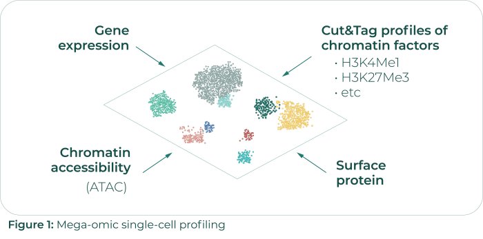 The CUT&Tag technique, on which Rahul’s single-cell method is based, can detect open-chromatin regions (OCRs) that are bound by specific chromatin factors. OCRs are indicative of actively transcribed DNA regions and are thus proxies of chromatin transcriptional activity. scCUT&Tag-pro provides simultaneous measurements of CUT&Tag profiles of specific chromatin factors involved in gene active transcription or repression, as well as cell surface protein levels in single cells. The protein level measurements have allowed them to use data mining techniques to stitch together all the datasets they have collected - gene expression, surface protein binding, chromatin accessibility, and scCUT&Tag-profiles of 6 different chromatin factors - into an atlas of what Rahul calls mega-omic single cell profiles (Figure 1).