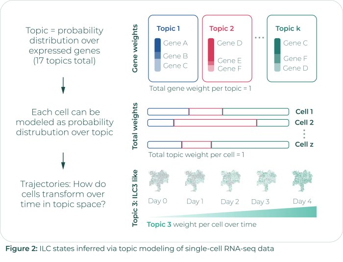 They chose this approach because it is simple and immediately interpretable (Figure 2). They use 17 topics, with each topic representing a gene program (a probability distribution over expressed genes). Each cell is modeled as a probability distribution over these topics.