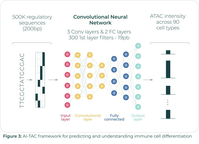 Mostafavi’s lab, in collaboration with the Benoist-Mathis lab at Harvard, has developed a convolutional neural network model, AI-TAC, which infers chromatin accessibility in different cell types solely by using regulatory DNA sequences as inputs (Figure 3).