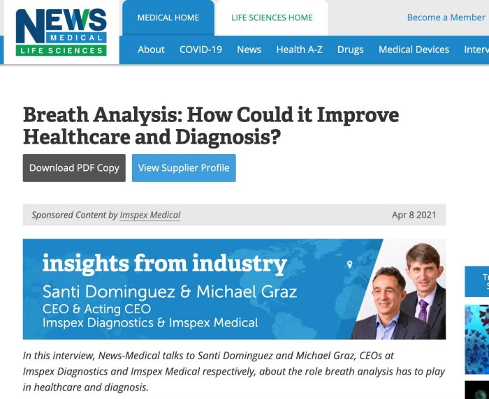The Imspex group has established credentials in using breath analysis for screening and diagnosis across a range of medical applications. The CEOs of Imspex Medical and Imspex Diagnostics shared some thoughts on the benefits that an understanding of breath and breath analysis expertise could bring to screening and early diagnosis of disease as a way of improving both the diagnosis experience for patients and treatment outcomes. Read more on News-Medical.net here to find out more.