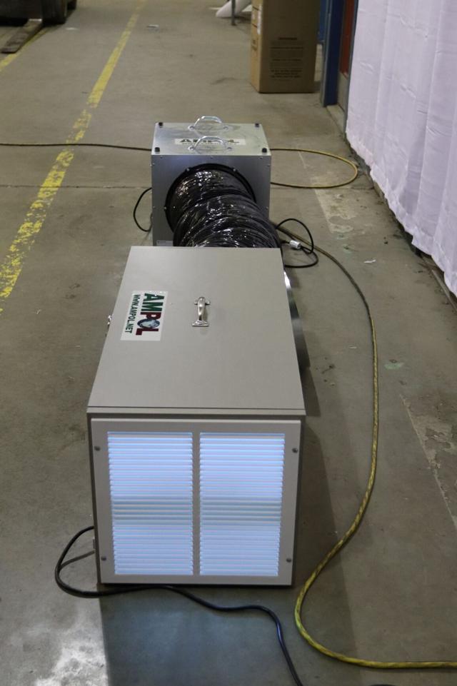 For gymnasiums or other large spaces, AMPOL often uses its UV HEPA Hogs, which are large industrial fans equipped with a UV light and HEPA filters. These must be run when people are not around because of the high velocity of the fan speed.