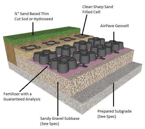 The AirPave flexible porous paving system always ships with enough for 2 layers of the guaranteed analysis fertilizer needed. One for the sub base to be worked in before compaction and watered. And the other to be added on top of the sand filled AirPave grid and watered in before the turf grass is installed. We believe if done properly it will set up the project for the best possible result.