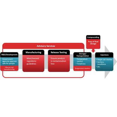 The above image shows at a high level how vaccines and other injectable treatments are kept safe at various stages of manufacturing. The red areas show where PMS supports safe treatments starting with contamination monitoring during clinical trials as well as at full manufacturing. We also participate in release testing and then environment monitoring during storage. When compounding as part of the application is needed, we can support pharmacists for ensuring a safe environment. Finally, in all topics of sterility assurance and contamination control during the full journey of the drug from the active pharmaceutical ingredients until the finished goods our Advisory Services team provides expertise guidance to pharmaceutical manufacturers to ensure they are meeting industry regulations and providing safe treatments to the end user.