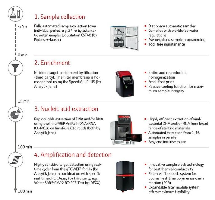 In order to overcome all challenges, we provide an efficient workflow solution for the detection of SARS-CoV-2 in wastewater - starting with representative wastewater sampling, continuing with effective enrichment and nucleic acid extraction and closing with the real-time PCR detection. Real-time PCR proofed to be the gold standard for the direct and highly sensitive detection of SARS-CoV-2 in research and clinical settings. It is ideal for the detection in wastewater as well.