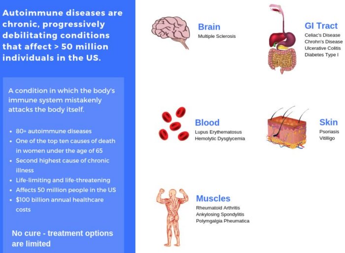 Thus far, more than 80 different autoimmune diseases have been identified, with some of the most prevalent including rheumatoid arthritis, Crohn’s disease, type 1 diabetes, and multiple sclerosis [1]. Autoimmune disease is one of the top ten causes of death in women under the age of 65 and is the second highest cause of chronic illness in America [2]. These diseases are often life-limiting, debilitating, and if left untreated can become life threatening. Current estimates indicate that roughly 50 million people in the United States are afflicted with an autoimmune disease and this represents a substantial economic burden in this country costing more than $100 billion dollars in annual healthcare costs [3]. And unlike other conditions such as cancer, there is currently no cure for autoimmune disease and treatment options are very limited.
