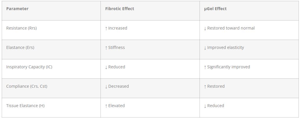 To validate therapeutic benefit, lung mechanics are assessed using flexiVent and forced oscillation technique (FOT). Key parameters demonstrate that µGel therapy significantly improves lung function toward normal levels: