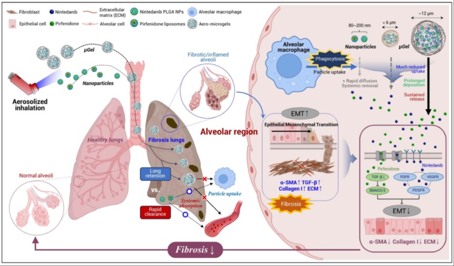 Idiopathic pulmonary fibrosis (IPF) is a devasting lung disease characterized by progressive scarring of lung tissue. As fibrosis develops, patients experience worsening shortness of breath, reduced lung capacity and ultimately respiratory failure. Current therapies for IPF rely on oral administration of pirfenidone and nintedanib, two FDA-approved drugs that slow disease progression. While effective, oral dosing requires high systematic concentrations, which often lead to gastrointestinal side effects and liver toxicity. A targeted approach that delivers these drugs directly to the lungs offers a transformative strategy.