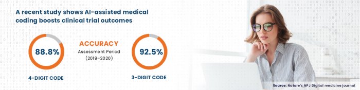 Accuracy in medical coding is a vital aspect in aiding clinical trial operation success. It has presented an excellent opportunity for medical coders, working hand-in-hand with AI-enhanced computer-assisted coding systems, to quickly identify and validate the correct codes. Using natural language processing (NLP) and advanced Machine Learning algorithms, AI is transforming medical coding by improving coding accuracy. In this blog, we’ll explore what this transformation means for clinical trial organizations.