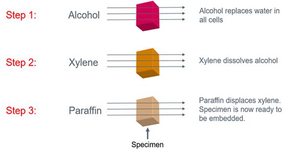 - The tissue sample is infiltrated paraffin wax, displacing the xylene
