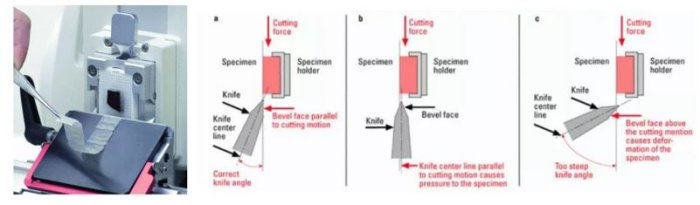 - Raising the angle slightly (~1/2 degree if possible) above the bevel angle. The goal is to avoid having the lower bevel face slide over the specimen block and possibly produce friction damage.
