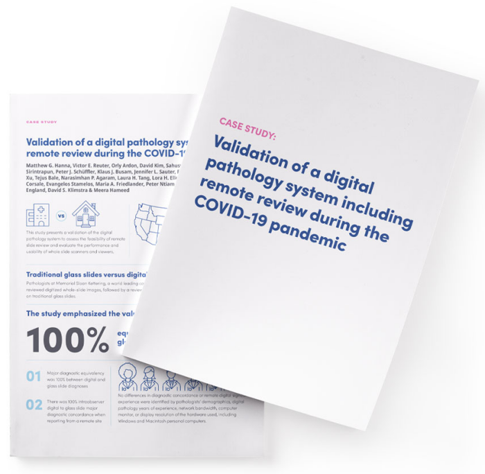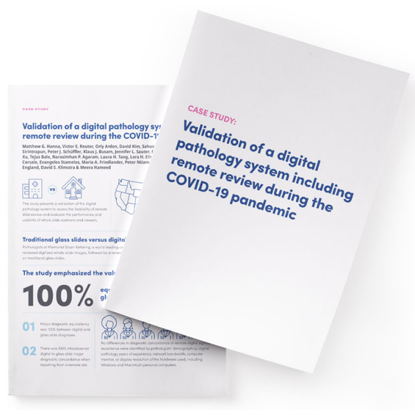 This study presents a validation of the digital pathology system to assess the feasibility of remote slide review and evaluate the performance and usability of whole slide scanners and viewers. Pathologists at Memorial Sloan Kettering, a world leading cancer center, reviewed digitized whole-slide images, followed by a review of the same case on traditional glass slides.