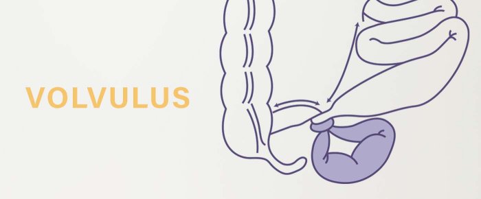 Volvulus occurs when a portion of the intestine loops around and folds over itself. This dangerous twisting of the intestines can cause a blockage and cut off blood flow. The damaged tissue may need to be removed via resection, depending on the severity of the case.