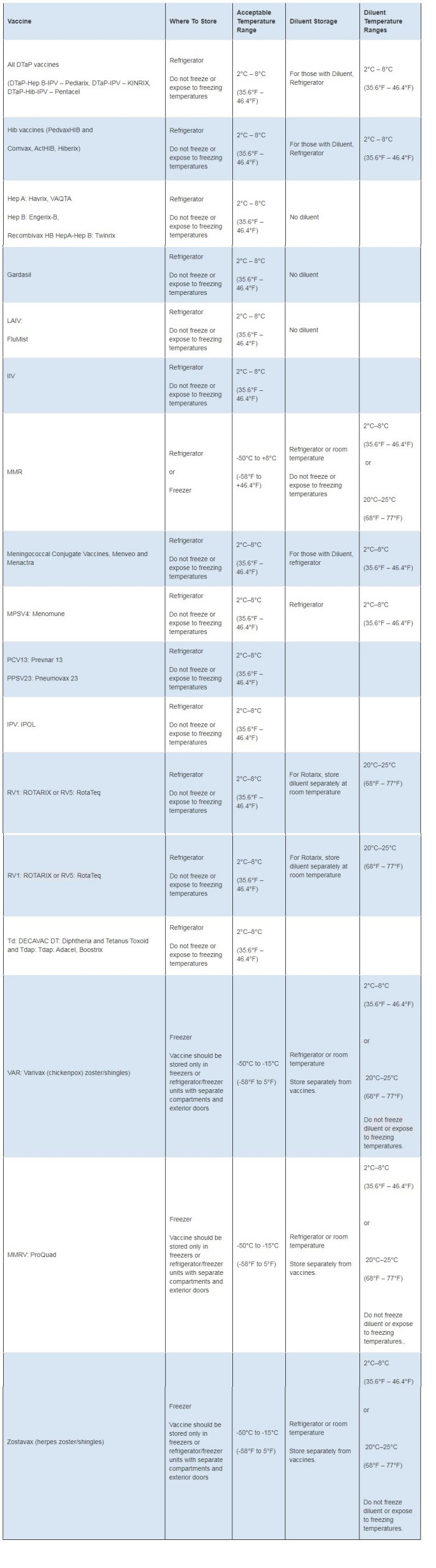 As mentioned above, vaccines must be correctly stored upon production. In addition, health care professionals must keep them within the recommended temperature range or they will lose their effectiveness. The ideal temperature range for vaccines is 2°C to 8°C (35.6°F to 46.4°F).