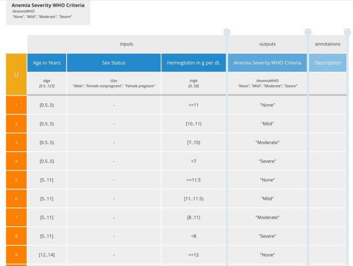 The World Health Organization (WHO) has a decision table that can answer the first two questions. It uses age, sex and hemoglobin as required inputs. The DMN model and a portion of the decision table are shown in Images 1 and 2. The oval items in the first image are data inputs, which can be provided by FHIR. The Reference node lists the knowledge sources and provides links to them or supporting media.