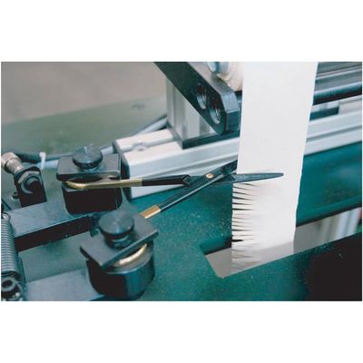 Pictured to the right is a scissors testing device used to compare various alloys and cutting edge styles. The scissors repeatedly cut through a continuous feed of cotton cloth, and a counter keeps track of the number of cuts made to evaluate when the scissors begin to show a decrease in cutting quality. The results verify that the addition of various features dramatically increases the cutting life of the scissors. Most notably, the cutting life is more than doubled by the addition of Tungsten Carbide blades to stainless steel, and over six times longer with Ceramix™ blades.