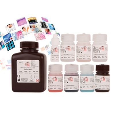 This kit is designed to label specific primary antibodies immunohistochemically on tissue sections. The immunohistochemical protocol defined in this brochure is just a guideline. We encourage the individual laboratory to optimize its own protocol baed upon tissue fixation conditions, primary antibodies employed, and the user’s experience. These reagents were tested and quality controlled using tissue sections, however, they can also be optimized for cell smears and cytospin preparations. Sufficient reagents are provided to run 50 to 100 tests.