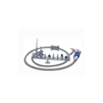 It is used for cleaning and disinfection of intended materials. Pressured water and air connection are available. It has 8 different adapter heads. The hose is resistant to pressure. There is a wall mount to adapt heads.