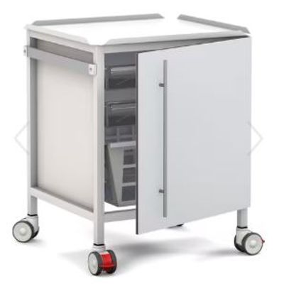 Freeway Vari – Cart Enclosed With SOLID TREPSA Door and Rear Panel 540(w) x 540(d) x 690(h)mm. Complete with: 4, 75mm high quality castors (2 braked). 2 x clear trays manufactured from SAN. 1 x deep basket, coated in white nylon modified polyester.
